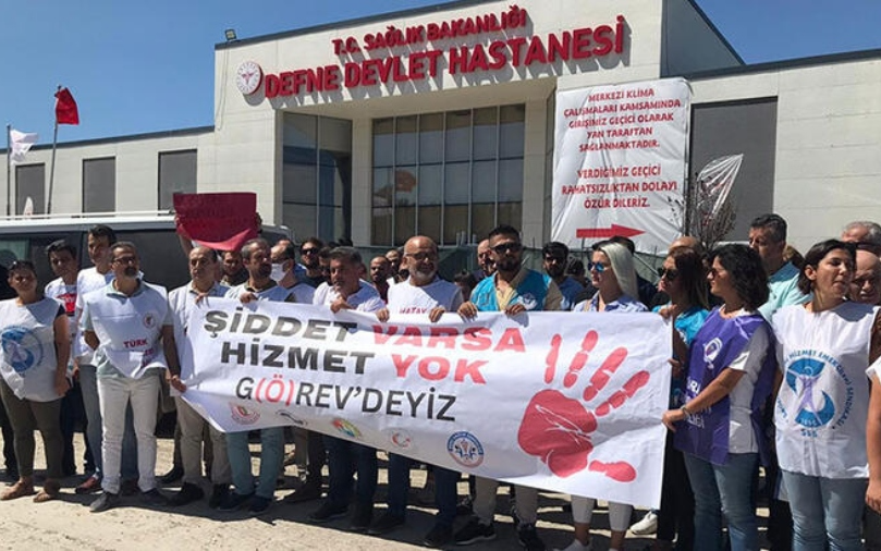 Saldırının ardından eylem kararı alan Hatay Tabip Odası, bugün iş bıraktı. Doktorlar ve çok sayıda sendika üyesi sağlık emekçisi, Defne Devlet Hastanesi önünde buluştu.